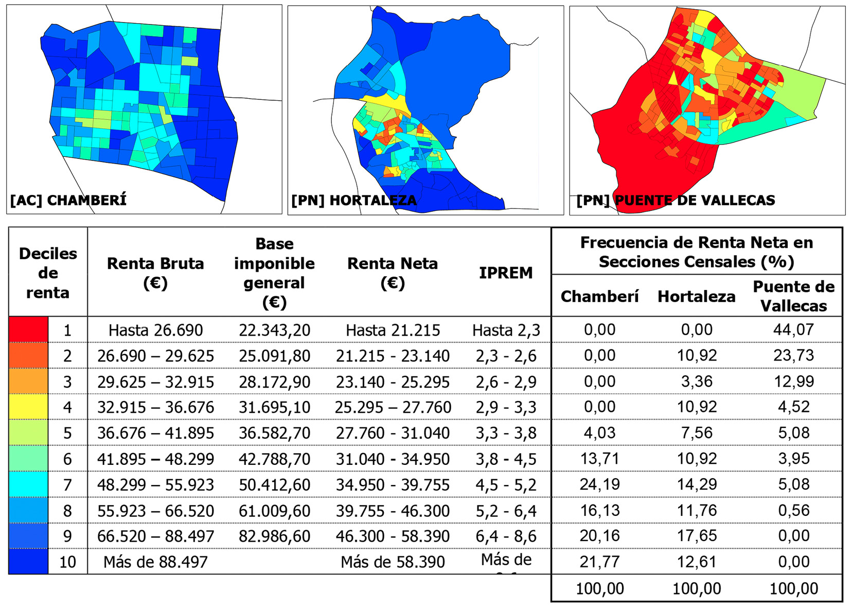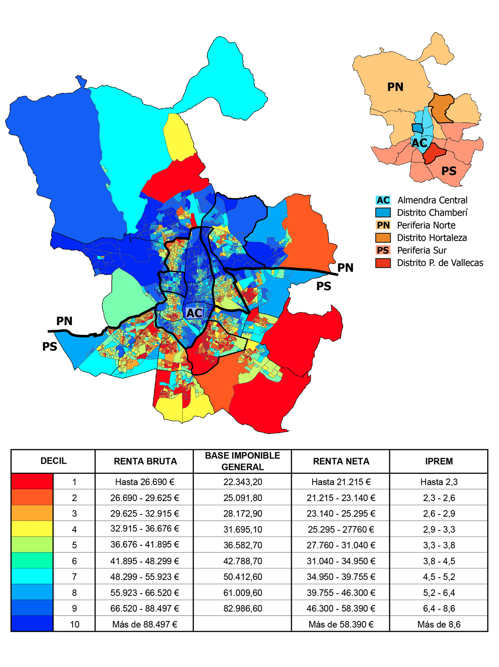 La ciudad de Madrid debe ser entendida como un sistema de elevada complejidad que organiza a la población en función de sus rentas en localizaciones espaciales concretas. La evolución propia de este proceso, sin mayor mediación que las rentas y el mercado de precios, tiende a la homogeneización y simplificación de las diversas zonas de la ciudad, organizadas por rentas, incrementando la desigualdad intraurbana. En las ciudades españolas, esta dinámica se ha producido de forma continuada durante las últimas décadas, independientemente de las coyunturas políticas y económicas, en un doble proceso de incremento y concentración espacial de la población vulnerable (Rodríguez-Suárez & al., 2021, Leal-Maldonado & Martínez-del Olmo, 2021, Domínguez-Pérez, Leal-Maldonado & Barañano-Cid, 2021).