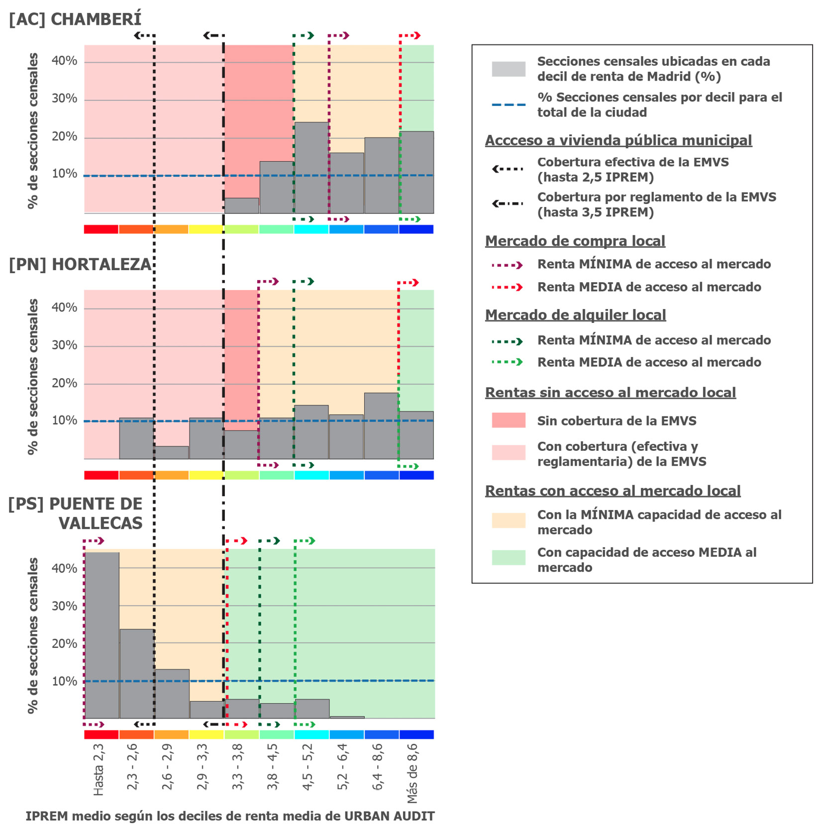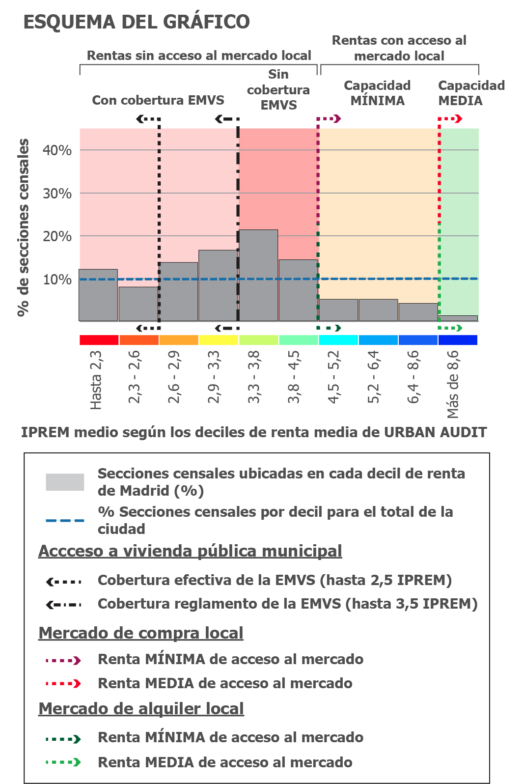 Del análisis de la capacidad de acceso a la vivienda de los hogares en la ciudad de Madrid, se concluye que si bien la cobertura teórica de las políticas municipales de la EMVS alcanzaría al menos a los 4 deciles inferiores de renta, al territorializar los datos por distrito, no existe cobertura real para los distritos de mayor renta y la totalidad de la política municipal se destina a los grupos de rentas bajas dentro de los distritos de menor renta, que son a su vez las únicas localizaciones en las que, por precios de mercado es posible garantizar el acceso a la vivienda. De este modo, la política municipal cubre únicamente a los grupos de rentas más bajas y sólo es capaz de ofrecer viviendas en los distritos de menores precios, forzando a los hogares de menores rentas que puedan existir en los distritos de rentas más altas a trasladarse a los distritos de rentas y precios bajos, en un proceso que contribuye a profundizar y consolidar el modelo de desigualdad y clasificación socioespacial en el que se ha desarrollado históricamente la ciudad.