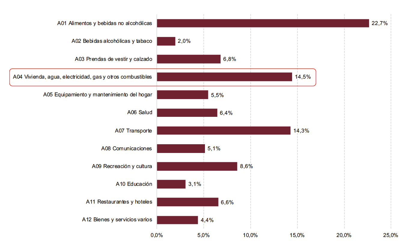 Estos valores son inferiores a los observados en otras partes del mundo. Por ejemplo, para el promedio de los países miembros de la OCDE los gastos relacionados con la vivienda constituyen el primero en importancia, representando un 22,2% de los totales. Sin embargo, en Chile, Colombia y México, países latinoamericanos que son miembros de la organización, estos gastos constituyen el segundo gasto en importancia (con una participación relativa de entre el 15,2 y 16,7% respecto al gasto total en consumo) y se encuentran superados por los gastos en alimentos y bebidas no alcohólicas (OCDE, 2021a).