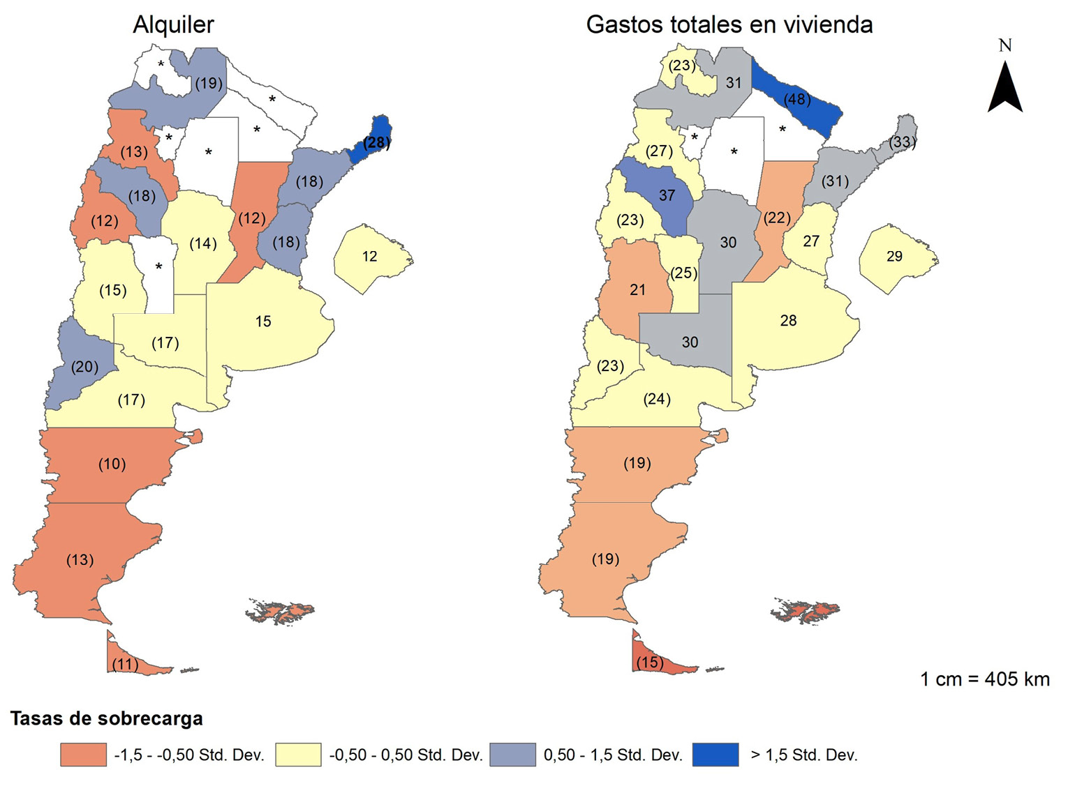 Se trabaja con las medidas tanto en términos absolutos como relativos. Mientras lo primero informa sobre la presión financiera a la que se enfrentan los hogares debido a estos gastos y comparar como la misma varía a lo largo de la distribución de ingresos, lo segundo estima la proporción de hogares que se encuentran sobrecargados o que sufren estrés financiero por la vivienda, y que, en consecuencia, pueden tener dificultades para cubrir otras necesidades básicas como alimentación, vestimenta, transporte y/o atención médica.