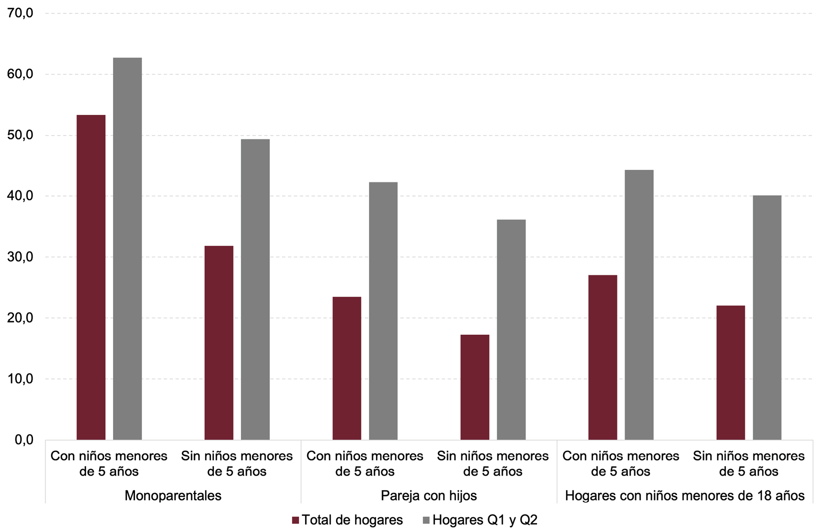 Al profundizar aún más los resultados e incorporamos la presencia de menores de 5 años en el hogar, en línea con lo sugerido por Stone & Burke & Ralston (2011) para un estudio sobre la asequibilidad en los Estados Unidos y en Australia, se observa que este indicador funciona como una especie de predictor de problemas de asequibilidad, especialmente para los hogares más pobres. Según puede observarse en la Fig. 7, los hogares con niños menores de 5 años presentan mayores tasas de sobrecarga por gastos en vivienda que aquellos que no y las mayores diferencias se observan en los hogares monoparentales. Por ejemplo, mientras el 49% de los hogares monoparentales más pobres sin hijos menores de 5 años tienen problemas de asequibilidad, ese porcentaje asciende al 63% en aquellos con al menos un hijo menor de 5 años.
