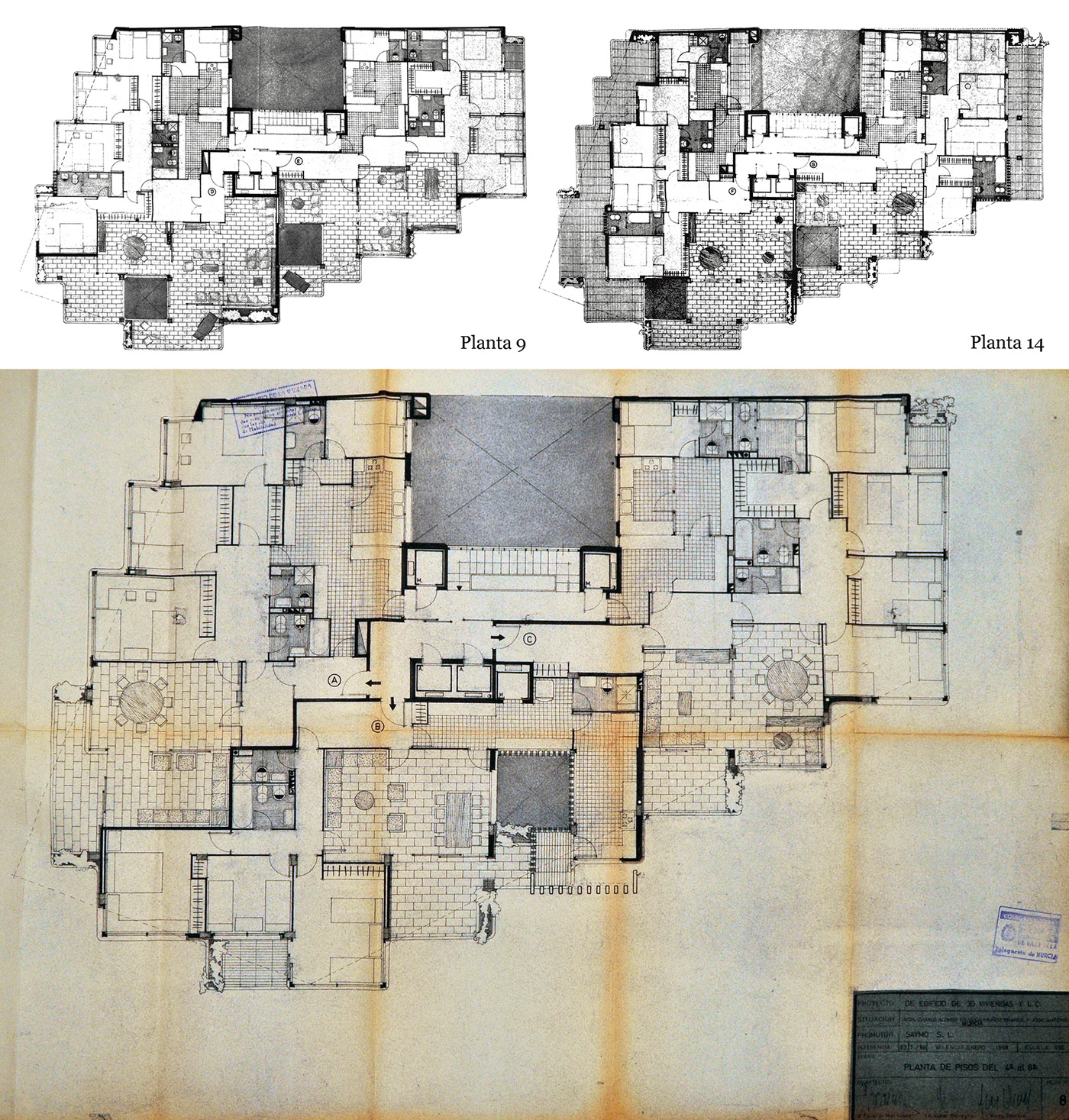 Fig. 5./ Escario-Vidal-Vives (EVV): Edificio ‘Vitalicio’, planos de plantas 9ª y 14ª, 1968 (arriba). Plano de planta tipo 4ª a 8ª (abajo)