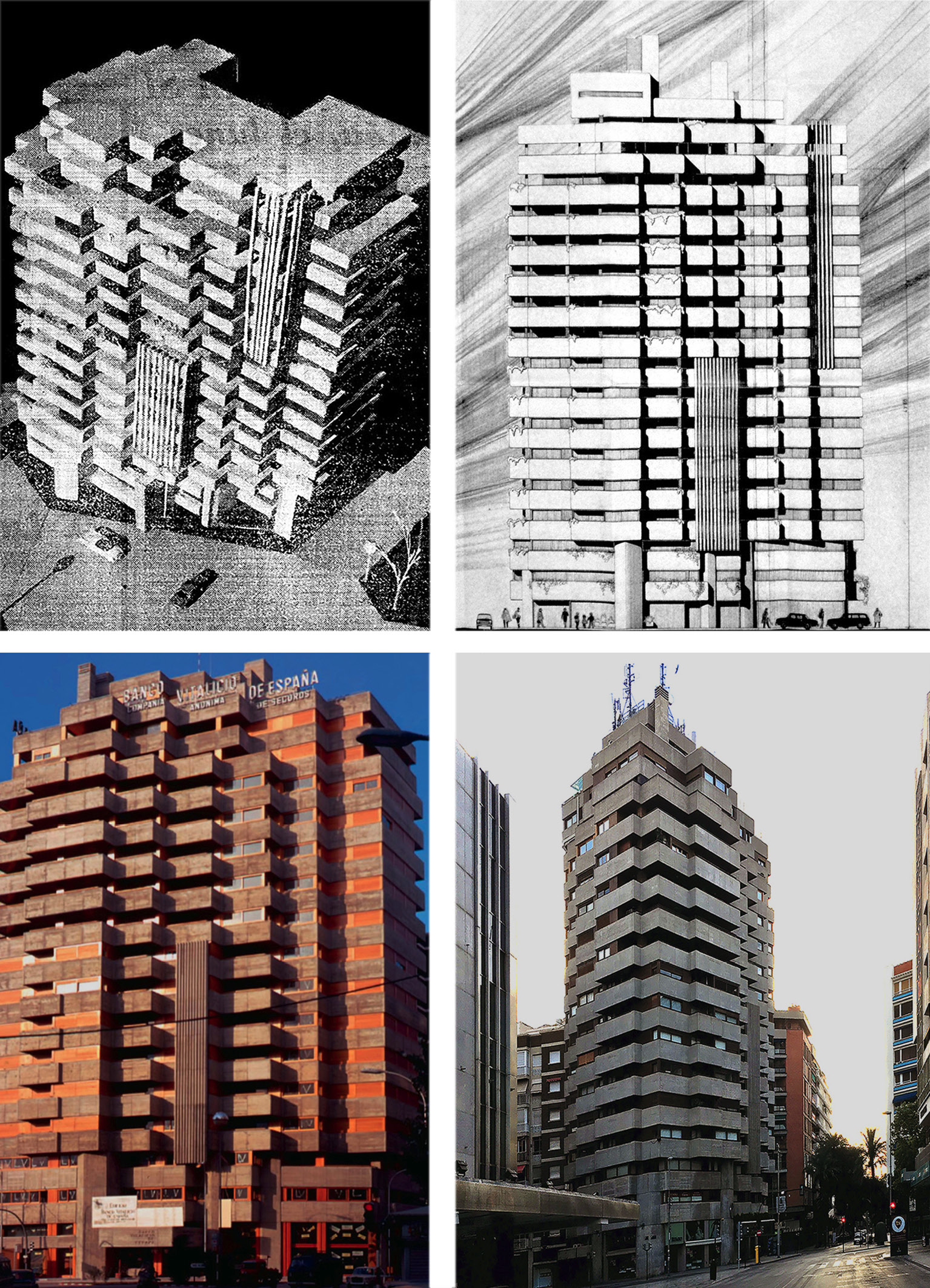 Fig. 8./ Escario-Vidal-Vives (EVV): Edificio ‘Vitalicio’, maqueta de 1967 (arriba izda). Alzado de 1968 (arriba dcha). Vista de la obra casi terminada, noviembre de 1971 (abajo izda). Vista desde la plaza Fuensanta en mayo de 2020 (abajo dcha)