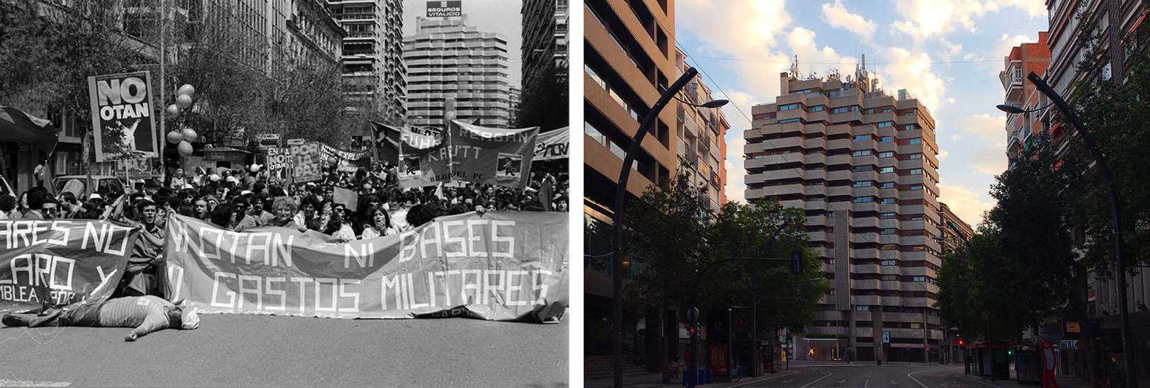 Fig. 1./ Escario-Vidal-Vives (EVV): Edificio ‘Vitalicio’ (1967-1972), actualmente ‘Hispania’, visto desde la Gran Vía de Murcia durante una manifestación en mayo de 1985 y el confinamiento de mayo de 2020
