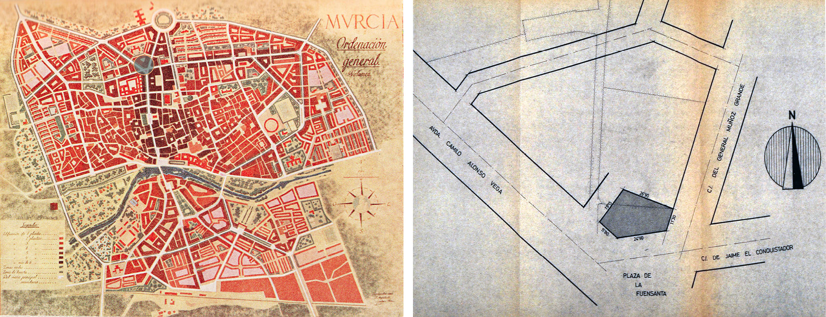 Fig. 2./ Plano de Murcia de Gaspar Blein de 1949 con el trazado definitivo de la Gran Vía donde se ha marcado con un círculo gris el emplazamiento de la obra (izquierda). Plano de situación del edificio ‘Vitalicio’ de Escario-Vidal-Vives (EVV), 1968 (derecha)