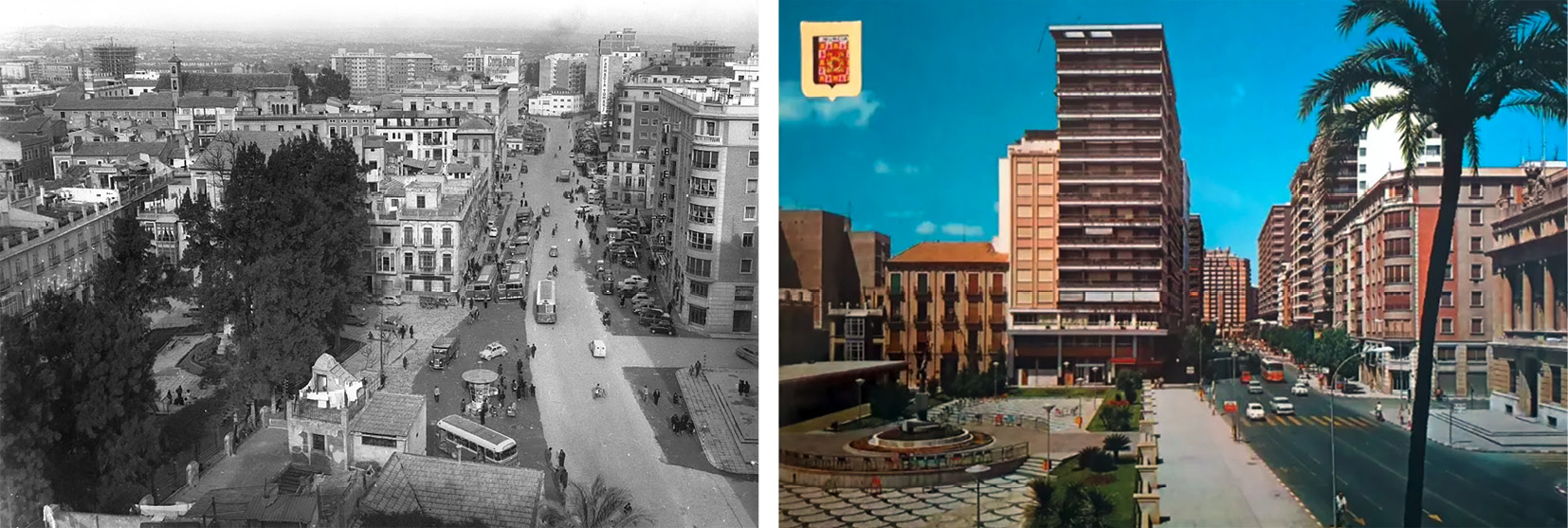 Fig. 3./ Plaza de Santa Isabel y vista de la Gran Vía de Murcia, aún en construcción, ca. 1965 (izquierda). Postal de la misma plaza transformada y de la Gran Vía ya concluida con el edificio ‘Vitalicio’, ca. 1973 (derecha)