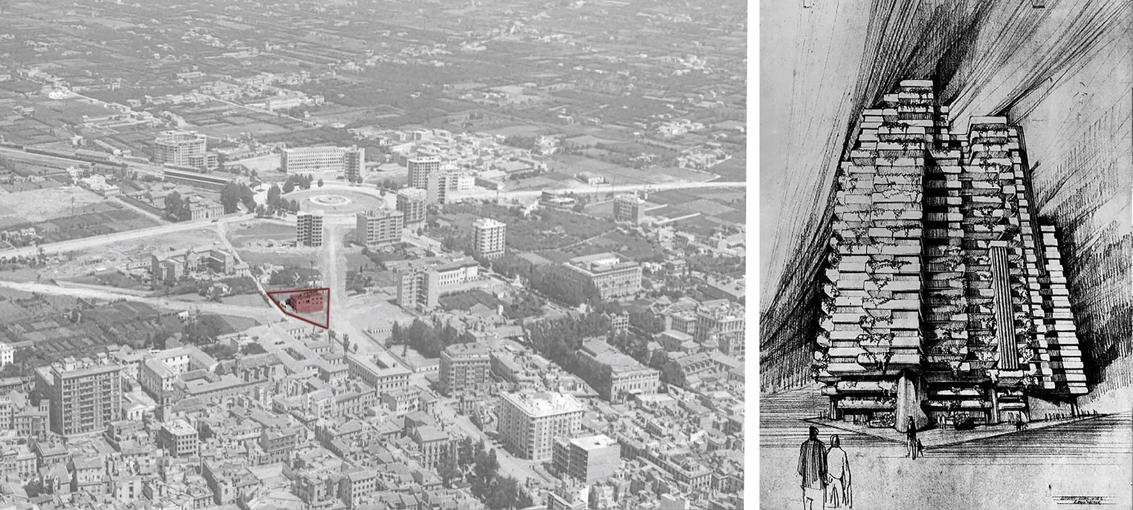 Fig. 4./ Vista aérea ca. 1965 de las inmediaciones del sanatorio y futura plaza Fuensanta (destacados en color rojo) donde se emplazaría el edificio ‘Vitalicio’ (izquierda). Dibujo promocional del proyecto, ca. 1967 (derecha)