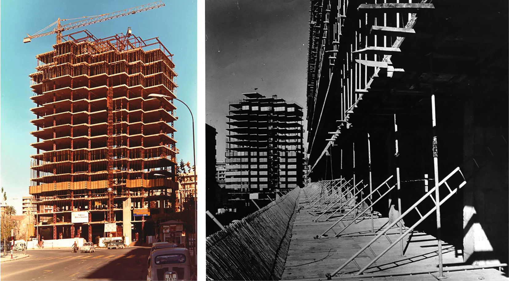 Fig. 6./ Escario-Vidal-Vives (EVV): Edificio ‘Vitalicio’ en construcción, 1971, visto a cota de calle (izquierda) y desde el edificio de Galerías Preciados, también en construcción (derecha)