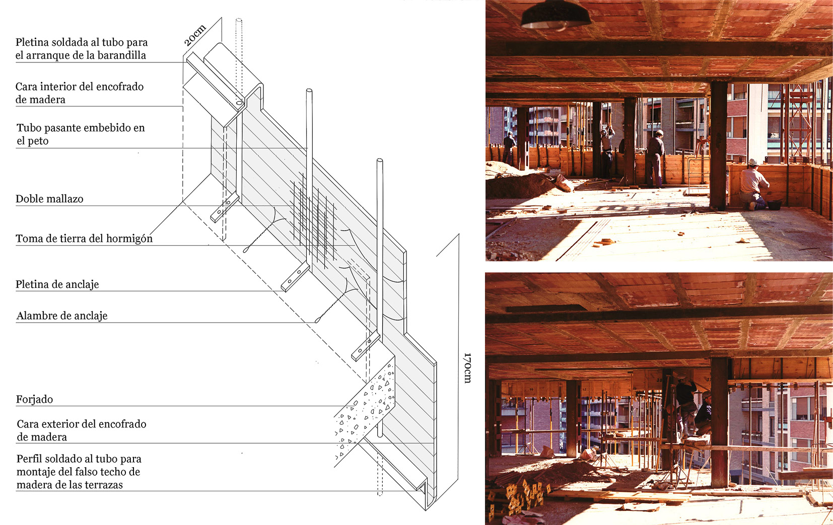 La cara interna del encofrado, confeccionado con listones machihembrados de madera de pino, se apoyaba en el forjado, mientras que la exterior sobresalía del mismo para formar una banda continua de 1,7 m de altura, medida desde el descuelgue del goterón del antepecho hasta su cara superior (Fig. 7). El espesor del peto (20 cm) permitía dos retranqueos de la mitad de esta dimensión. Una vez cortados los tubos pasantes, se les soldaba, según el caso, una pletina o un angular que posibilitaban, respectivamente, fijar la perfilería de la barandilla de madera en el plano superior y, en el inferior, recibir el revestimiento, igualmente de madera, de la cara inferior de los forjados de las terrazas.