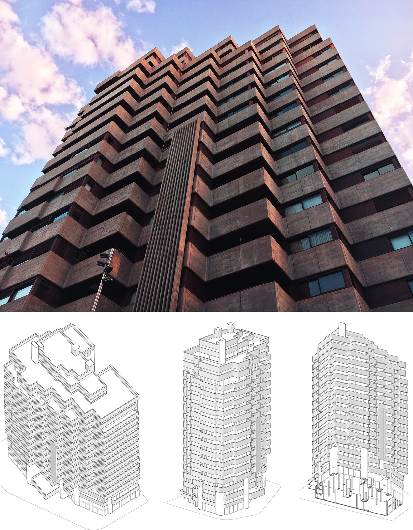 Fig. 9./ Escario-Vidal-Vives (EVV): Edificio ‘Vitalicio’, fotografía cercana de la fachada sur y vistas axonométricas, agosto de 2021