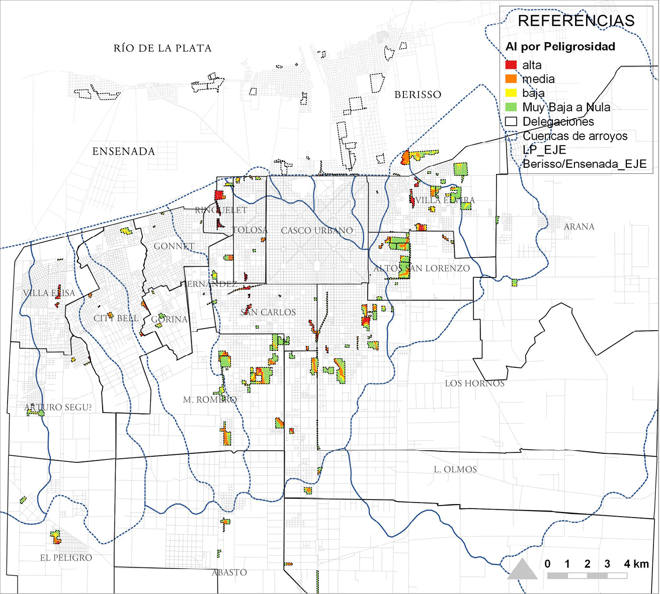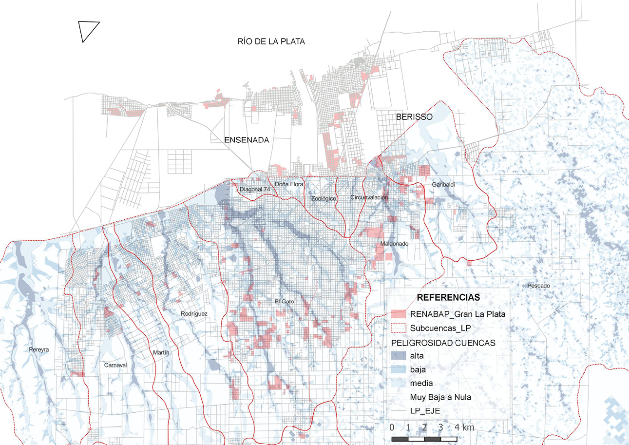 El municipio de la ciudad de La Plata, limita al Este con los de Ensenada y Berisso conformando el Gran La Plata (Fig. 1). El mismo, se localiza sobre áreas aluvionales naturales, albardones costeros y bañados que actúan como buffers naturales. La zona presenta un período de lluvias por encima de la media histórica secular (1007 mm anuales) la cual dificulta la particularidad del relieve de muy poca pendiente (entre 0,06 a 0,1%) (Fucks, 2017) provoca que, ante eventos de grandes precipitaciones, ocurran inundaciones y anegamientos. (Arteaga, 2011) En la Fig. 1, se observa el sistema de arroyos con sus cuencas hidrográficas, la localización de los asentamientos informales y la peligrosidad hídrica.