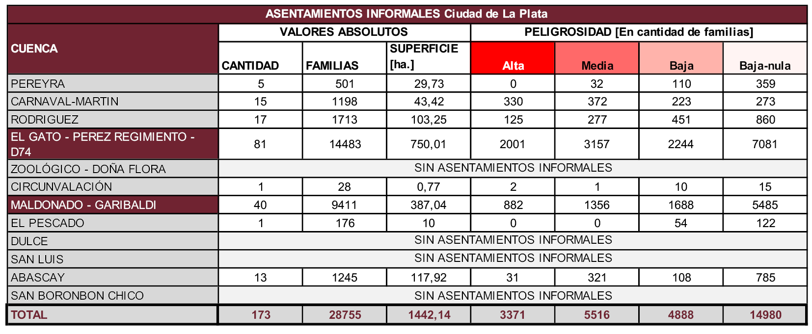 A continuación, se detalla cada uno de ellos en función de la cuenca en la cual se encuentra situado, el tipo de asentamiento (villa, asentamiento precario u otro), año de origen, superficie (en hectáreas), estado del mismo (altamente precario, precario, levemente precario) y cantidad de familias en cada uno de los rangos de peligrosidad establecidos (alta, media, baja y muy baja). (Fig. 9)