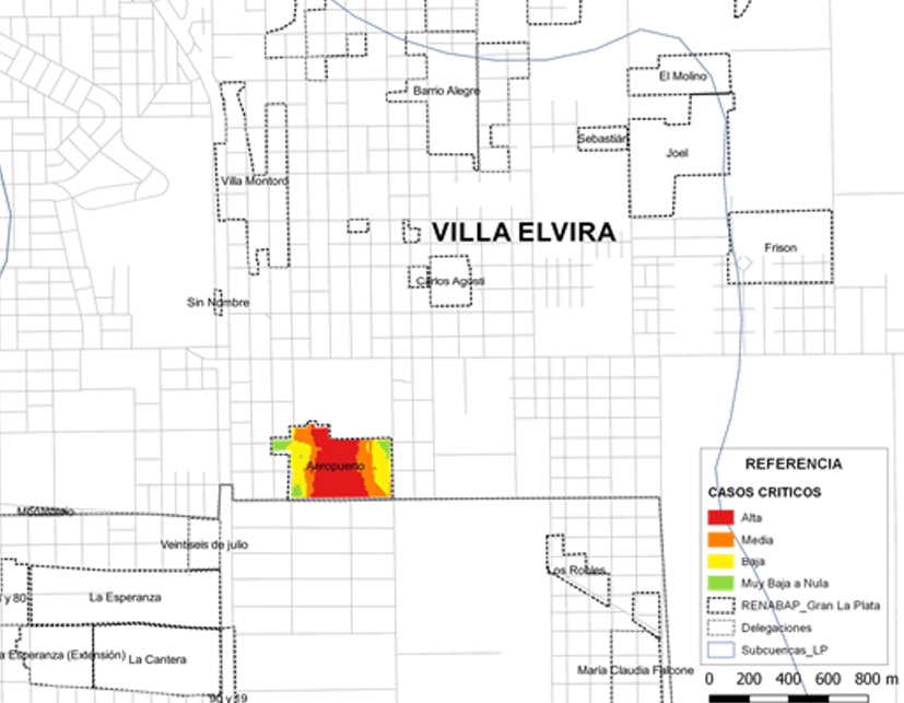 El Barrio Aeropuerto, es uno de los tantos barrios que componen la delegación de Villa Elvira, en la periferia Sur-este de la ciudad de La Plata. Dicha delegación, se constituyó a mediados de 1930 en base a quinteros, comerciantes y trabajadores del casco urbano de la ciudad. Ya en la década del 80, con el aporte de población proveniente de provincias del interior y países limítrofes, el barrio se consolida como tal, con establecimientos escolares, centros de fomento y clubes de barrio. Hoy en día, la delegación ocupa el 10% del partido de La Plata. Con más de 80 mil habitantes es uno de los sectores con mayores deficiencias edilicias, sanitarias y educativas de la ciudad. El Barrio Aeropuerto, no ajeno a esta situación, es un asentamiento precario compuesto por 900 familias, las cuales en su mayoría no poseen título de propiedad de la tierra, las cuales conviven con un deficiente o nulo servicio de agua, gas y cloacas. Además, existen sectores con basurales clandestinos y/o inaccesibles por la falta de asfalto, entre otros inconvenientes. Las características del mismo, respecto al riesgo hídrico, son las siguientes: