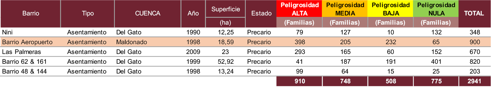 El Barrio Aeropuerto se caracteriza por un importante sector bajo peligrosidad alta y media, correspondiendo a un 67% de la superficie total del barrio. De ese porcentaje, 8,24 ha. (44 %) y 398 familias, se encuentran bajo peligrosidad alta y 4,23 ha. (23 %) y 205 familias, bajo peligrosidad media. El resto, 6,10 ha. (33 %) y 287 familias, bajo riesgo bajo o nulo, el cual es despreciable para este trabajo.