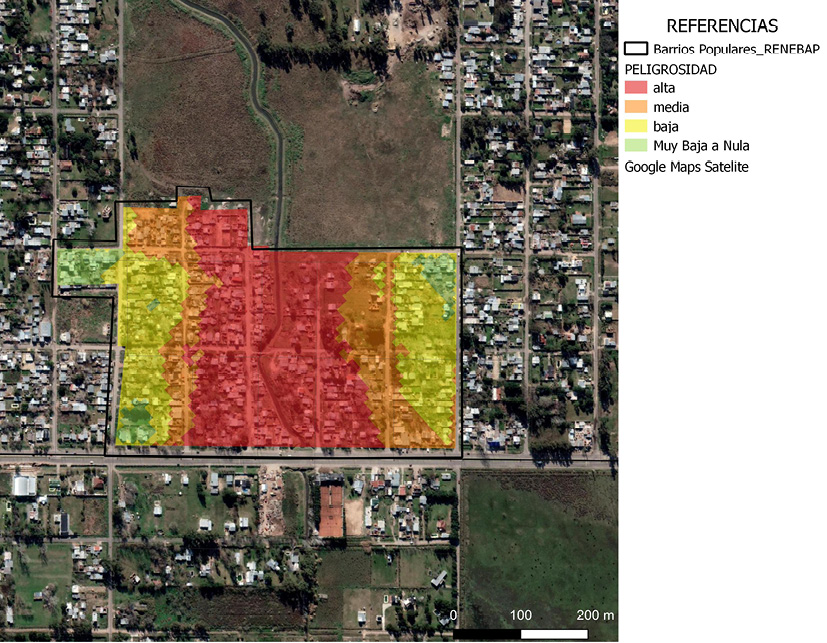● Calles intransitables por eventual inundación (peligrosidad de calles); ●. Áreas vacantes en el sector, con posibilidad de ocupación en el corto o mediano plazo y; ●. Superficie del área en peligrosidad alta, media, baja y nula en función de que el barrio se asienta sobre los humedales del arroyo Maldonado (Figs. 10 a y 10 b).
