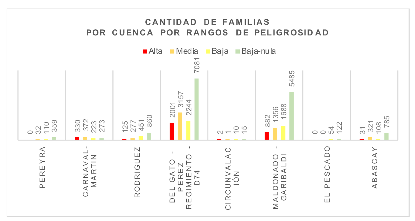 En la Fig. 12 se observa la cantidad de familias por cuenca por rangos de peligrosidad, identificando a la cuenca del arroyo Del Gato como la de mayor afectación, con 14 483 familias (y un 36% del total en peligrosidad alta y media).