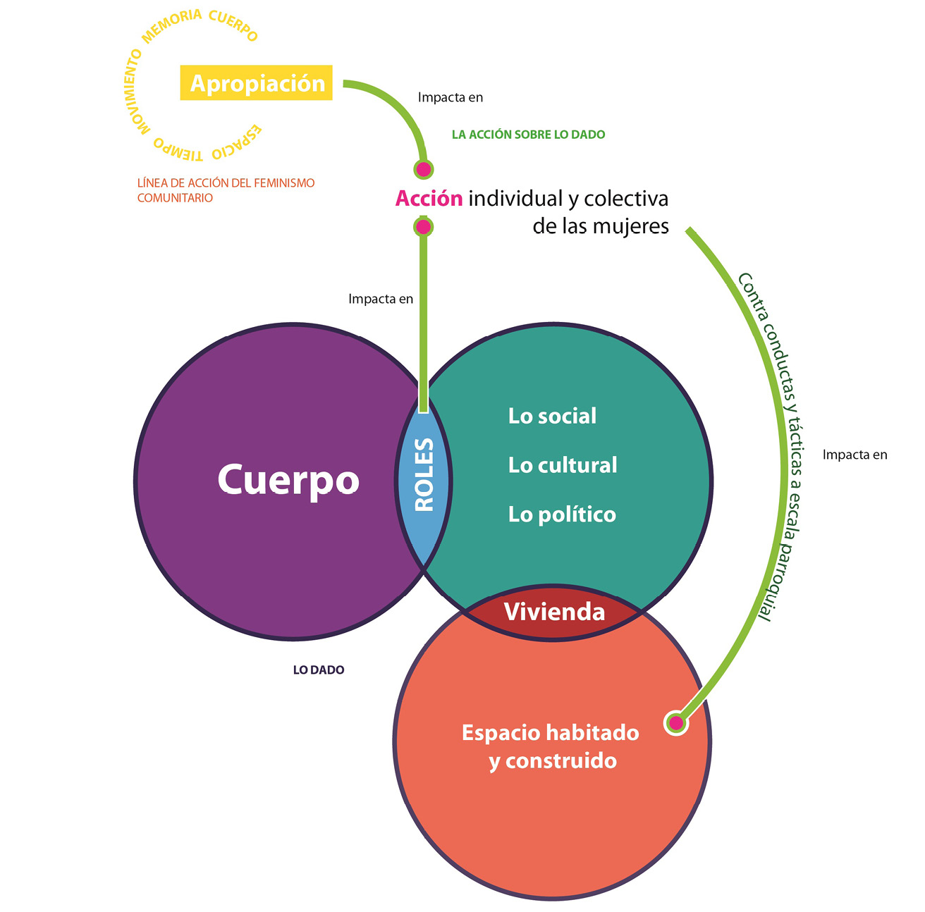 Según Paredes (2014) el cuerpo es el primer lugar que se habita, tiene una existencia individual y colectiva al mismo tiempo y se desenvuelve en tres ámbitos: la cotidianeidad, la propia biografía y la historia de los pueblos. El cuerpo se refiere, en este caso, exclusivamente al de las mujeres, el cual no es igual al de los varones y por tanto conlleva acciones y procesos distintos. Este campo de acción toma en cuenta aspectos tales como la salud, la información, el conocimiento, el placer, la libertad sexual, la representación política, los derechos y las habilidades de las mujeres, por mencionar algunos. El espacio es el envolvente, el lugar donde es, crece y se desarrolla la vida; es la vivienda, la tierra, la escuela, la calle, la comunidad, el espacio público y privado; el tiempo es como se mide la vida, este abre espacios para producir procesos de transformación en la comunidad y la propia historia, es aquí donde se llevan a cabo actividades imprescindibles necesarias para cuidar y mejorar la vida de los hombres y mujeres en comunidad; el movimiento: permite construir un cuerpo social, un cuerpo común que lucha por vivir y vivir bien, permite responsabilizarse de las acciones políticas, son las organizaciones, las alianzas, las propuestas comunitarias, la complementariedad entre mujeres; finalmente, la memoria se refiere a las raíces de las mujeres, a la identidad que se construye, a la sabiduría que se hereda, a la producción económica y espacial y a la recuperación de los valores identitarios.
