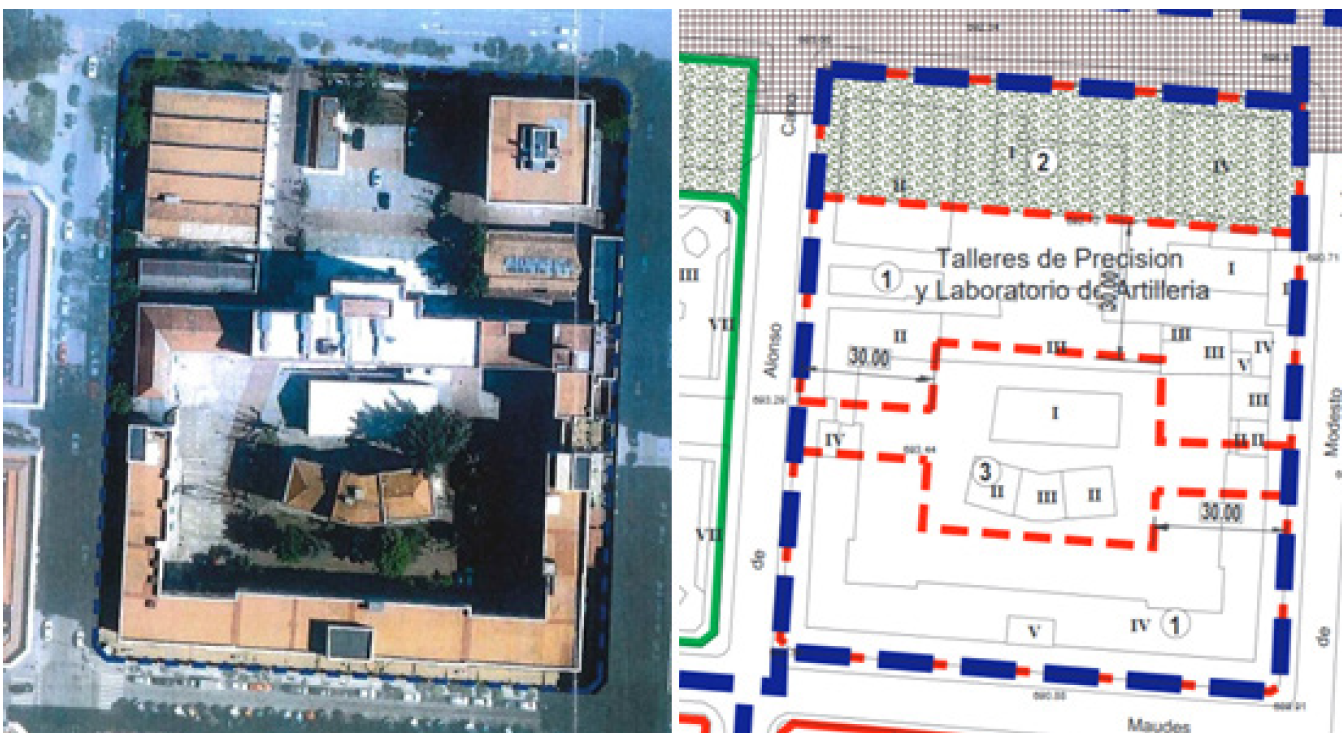 El Taller de Precisión de Artillería (TPA) fue un establecimiento militar creado por la Real Orden de 26 de febrero de 1898 con el nombre de “Taller de Precisión y Laboratorio de Artillería” y emplazado originalmente en el Ensanche Norte de Madrid, en el barrio de Ríos Rosas, actual distrito de Chamberí, en el Ensanche Norte de Madrid (Fig. 2). Las antiguas instalaciones militares ocupaban una manzana entera contando con una superficie total de 14 568,78 m² y una edificabilidad aproximada de 16 520 m² que, tras la operación urbanística lograba alcanzar los 54 225 m2c. Pese a que el planeamiento vigente databa de 1997, la operación urbanística no se había llevado a cabo ya que el importante incremento de edificabilidad obligaba a hacer importantes cesiones de suelo al Ayuntamiento de Madrid con destino a zonas verdes y equipamientos públicos. En concreto le correspondía una cesión de 16 267 m² cuando la superficie de la parcela era algo menos de 2000 m² inferior. Esta cuestión se resolvería en 2013 con la aprobación de la estatal Ley de Medidas Fiscales y Administrativas que permite monetizar las cesiones obligatorias de suelo para zonas verdes y equipamientos.