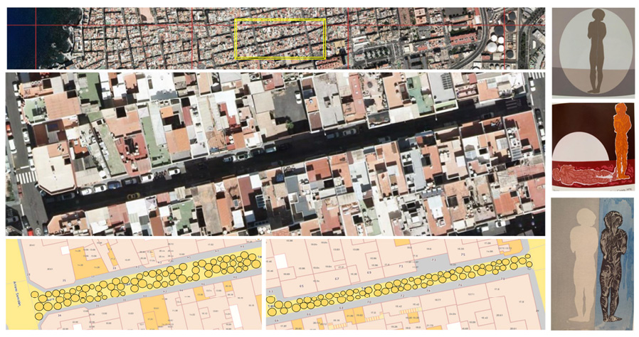 Fig. 3 / Tramo de la calle Tauro comprendido entre las calles Artemi Semidán y Benecharo. Largo: 155 m. Imagen de situación y panel explicativo del proyecto de Alfombra Humana basado en el diseño del vecino y artista Pepe Dámaso. Mapa en el que se apoyan los vecinos para la acción