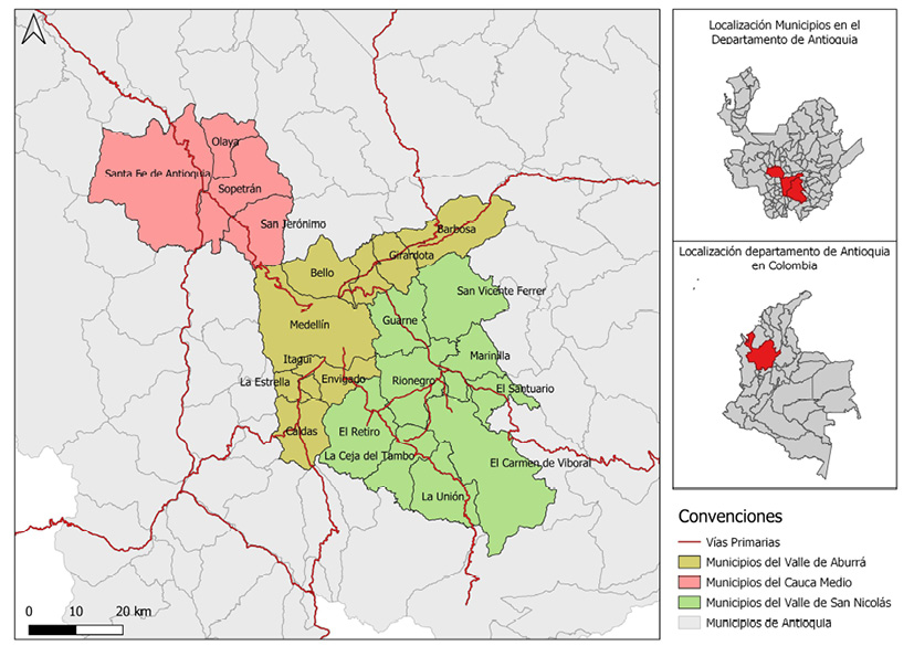 Antes de presentar en detalle las transformaciones territoriales de las dos zonas de estudio a partir de la expansión del proyecto Medellín, es pertinente realizar una descripción general de los tres territorios analizados. Estos se localizan en el centro del departamento de Antioquia (Fig. 1), el Valle de Aburrá, donde se localiza Medellín, administrativamente se entiende como una de las nueve subregiones del departamento y adicionalmente, está constituido legalmente como un Área Metropolitana. El Valle de San Nicolás es una de las zonas que compone la subregión Oriente de Antioquia; mientras que el Cauca Medio también es una zona al interior de la subregión del Occidente del departamento. En la Fig. 2 se hace una descripción general de cada uno de los municipios que componen a estos tres territorios estudiados.