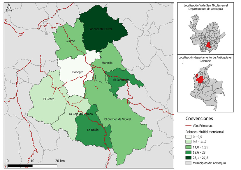 La ciudad de Medellín, capital del departamento de Antioquia, junto al área metropolitana del Valle de Aburrá, configuran la principal centralidad urbana y económica del departamento de Antioquia1, además, esta ciudad fue considerada a lo largo del siglo XX como un polo industrial del país y segunda con mayor aporte al Producto Interno Bruto nacional. Esta aglomeración presenta altos niveles de conectividad con el Valle de San Nicolás, en la subregión del Oriente Antioqueño y con los municipios turísticos del Cauca Medio, como se observa en la Fig. 1. Las tres zonas presentan hoy altas diferencias y desigualdades entre sí. De acuerdo con el Índice Multidimensional de Condiciones de Vida el Valle de Aburrá tiene un nivel promedio del 47,7%, el Oriente Antioqueño de 43,7% y los municipios turísticos del Cauca Medio un índice de 34,23% (Gobernación de Antioquia, 2021a). Asimismo, a nivel poblacional, el Valle de Aburrá concentra el 60.73% de la población departamental, donde la ciudad de Medellín tiene el 37,94%. El Oriente Antioqueño concentra un 10,42% y el Cauca Medio, el 3,18% (Gobernación de Antioquia, 2021b). En términos económicos, el Valle de Aburrá aportaba a 2020 el 64,39 % del PIB departamental, el Oriente Antioqueño el 10,49% y el Occidente el 2,43%, (Gobernación de Antioquia, 2021b), tendencia que no ha variado significativamente en los últimos 40 años. Esta disparidad se traduce en una alta desigualdad entre las tres zonas. Además, las relaciones de poder tienden a centralizarse en la zona con mejores indicadores, haciendo que sus intereses, como se discutirá a lo largo del artículo, redefinan los procesos internos de organización territorial y desarrollo del Valle de San Nicolás y de los municipios turísticos del Cauca Medio.