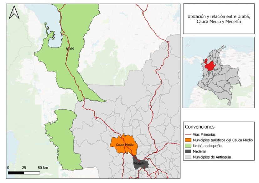 Los municipios turísticos del Cauca Medio son Santa Fe de Antioquia, San Jerónimo, Sopetrán y Olaya. Estos cuatro municipios se localizan en la subregión Occidente del departamento de Antioquia. Su potencial turístico radica principalmente en el clima cálido, la cercanía con el Valle de Aburrá y la historia y arquitectura con la que cuenta específicamente Santa Fe de Antioquia. Un aspecto relacionado con esta localización geográfica tiene que ver con que es el paso obligado para salir del Valle de Aburrá hacia el Urabá antioqueño, región donde se ubica el mar que está en jurisdicción del departamento de Antioquia, para ello se debe tener en cuenta que Urabá solamente se anexa oficialmente a Antioquia en 1905 (Jaramillo, 1991) (Fig. 5). Tal ubicación hace que estos municipios experimenten constantemente intervenciones viales con la finalidad de acercar más al Valle de Aburrá a los mercados internacionales. Así, el hecho que une la historia de Santa Fe y Urabá es la construcción de la vía al mar, que sólo hasta 1955 llega a Urabá, aunque su construcción se remontaba a 1920 (Botero, 1991).