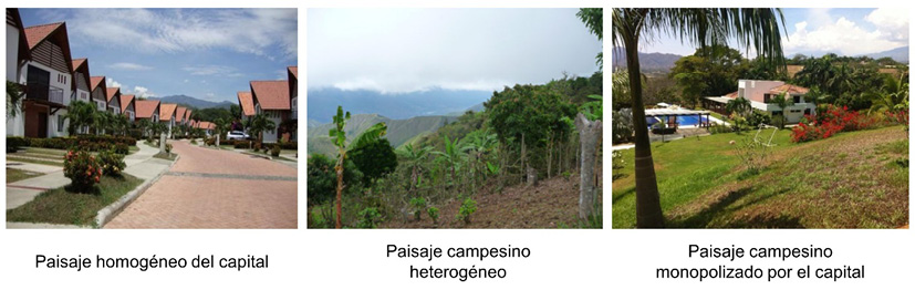 En la Fig. 8 se muestran tres tipos de paisajes que se han venido presentando en el Cauca Medio y, en especial en Santa Fe de Antioquia, a causa de la intervención del capital, en este caso no por un agronegocio, como lo plantea Mançano, pero sí son un reflejo de las disputas entre el campesino y el capital, enmarcado aquí en el turismo. En el paisaje homogéneo se encuentran las urbanizaciones, mostrando el extremo donde el capital es dominante. En el paisaje del campesino, donde se presenta una producción heterogénea, es el campesino quien tiene la primacía. Por último, el paisaje del campesino monopolizado, es donde ya el campesino comienza a adaptarse a esas directrices del capital y de allí que adapte su finca para la actividad turística también, aunque con presencia de ciertos espacios para continuar la actividad agrícola.