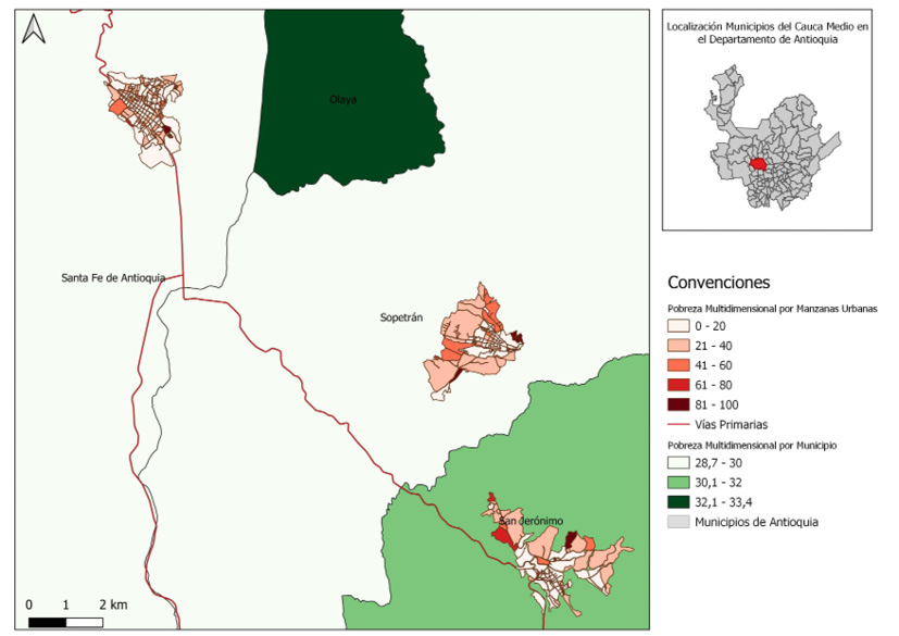 Todas estas transformaciones territoriales causadas por intereses externos, muestran una dinámica económica interesante en los municipios, de hecho, han crecido la cantidad de empresas en estos municipios y se consolidan como unos de los que más localizan empresas en el Occidente de Antioquia (Cámara de Comercio de Medellín, 2019). Sin embargo, eso no se ha plasmado en iguales resultados sociales. Por ejemplo, en la Fig. 10 se muestra los niveles de pobreza multidimensional a nivel municipal y de manzana urbana en el Cauca Medio. Como se observa la mayoría de los municipios se encuentran en un promedio del 30% de pobreza multidimensional, mientras que el promedio departamental es de 17,1% y el nacional de 19,6%. Esto significa que están muy por debajo de las condiciones regionales y nacionales.