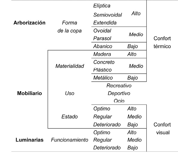 En cuanto al mobiliario, se identifica el material para determinar sus niveles de calor, de modo que, mientras mayor sea su conducción, menor será su capacidad de confort. En consecuencia, el acero-metal se considera bajo (1), concreto medio (2) y madera, plástico alto (3). Si el mobiliario está dañado o incompleto y por ende no es posible utilizarlo, se califica bajo (1), medio (2) cuando hay deterioro por óxido, grietas, fisuras, acristalamiento, pudrición u hongos, pero puede ser solucionado con mantenimiento, y alto (3) cuando se encuentra en óptimo estado.