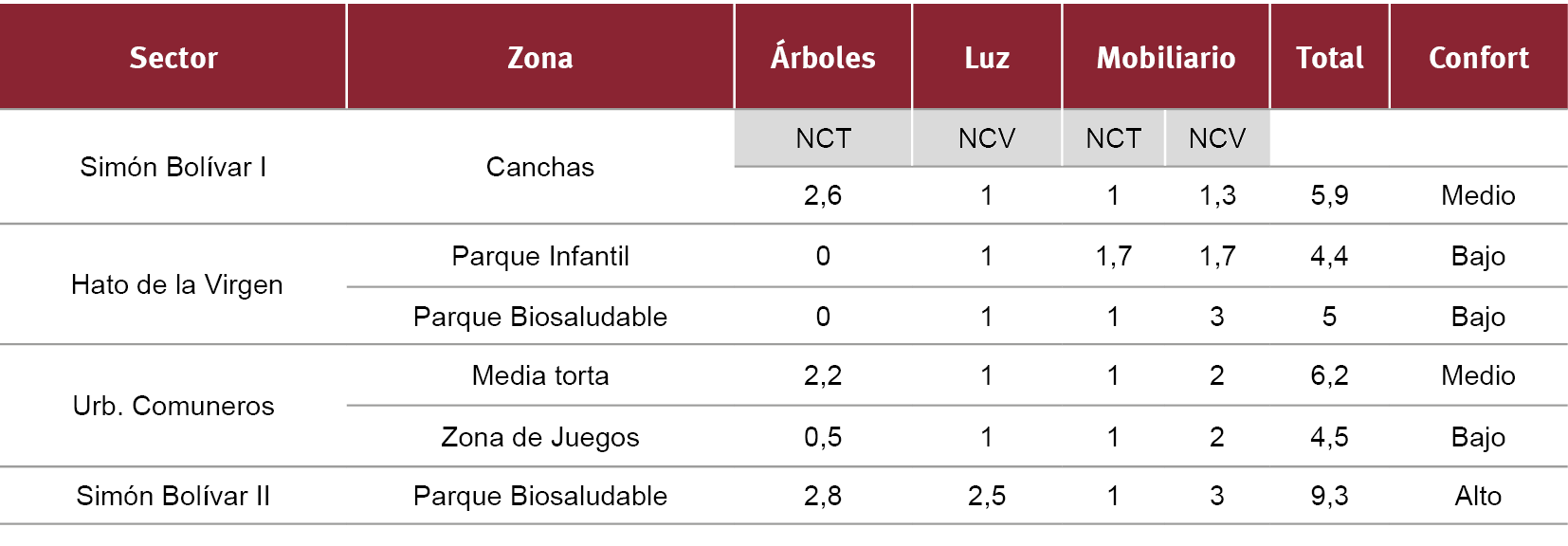 La cancha y media torta contaron con un calificativo medio, relacionado con el bajo porcentaje arbóreo y nivel térmico del mobiliario, además de la baja cantidad de luminarias. El parque de Hato de la virgen fue el que menor porcentaje obtuvo, debido a la carencia de vegetación que mejore el confort. Esta característica enfatiza la consideración de la importancia del confort dentro del espacio público, pues incentiva el uso y permanencia de la comunidad, que refuerza el concepto de “ojos en la calle”, o sensación de seguridad por la presencia constante de personas en el espacio público (Vicentini, 2019, p. 100).