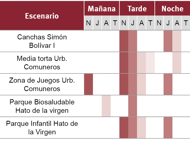Para la tabulación de los datos se tomaron, los escenarios, los periodos del día y la población de niños (N), jóvenes (J), adultos (A) y tercera edad (T). De este modo se establece, que el horario de mayor permanencia para todas las edades es la jornada de la tarde, el de menor permanencia es el de la mañana, seguido de la noche, y el escenario de menor permanencia es el parque Biosaludable o zona de actividades físicas del Hato de la Virgen. Estos datos nos indican que, en la jornada de la mañana, la población etaria seleccionada, desarrolla otro tipo de actividades tales como trabajo, estudio y quehaceres; que impiden la asistencia a los parques con mayor frecuencia como se observa durante la jornada de la tarde. Sin embargo, el cambio de permanencia que se tiene entre la jornada de tarde en comparación con la noche, da muestra de la dependencia o dificultades que tienen niños y adultos mayores para hacer uso de los parques en este horario, además, de ser un indicador sobre como la percepción de inseguridad que tienen los usuarios, puede ocasionar menores periodos de uso de los parques por parte de jóvenes y adultos (Fig. 6).