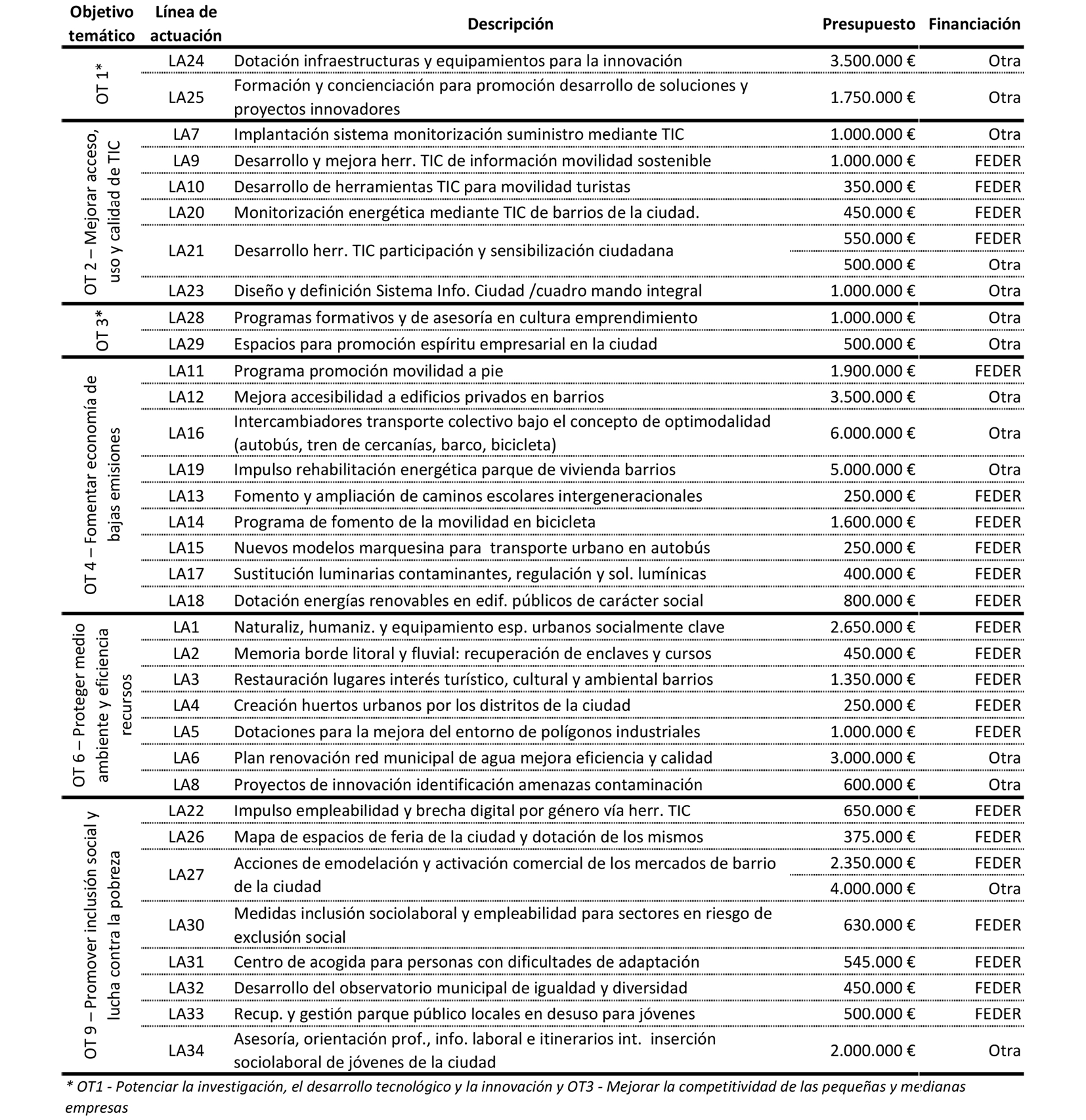 Fig. 2/ Líneas de actuación planteadas por la Estrategia de Desarrollo Urbano Sostenible Integrado (EDUSI), ordenadas por Objetivo Temático (OT) de los Fondos Europeos de Desarrollo Regional (FEDER) y con el presupuesto planteado