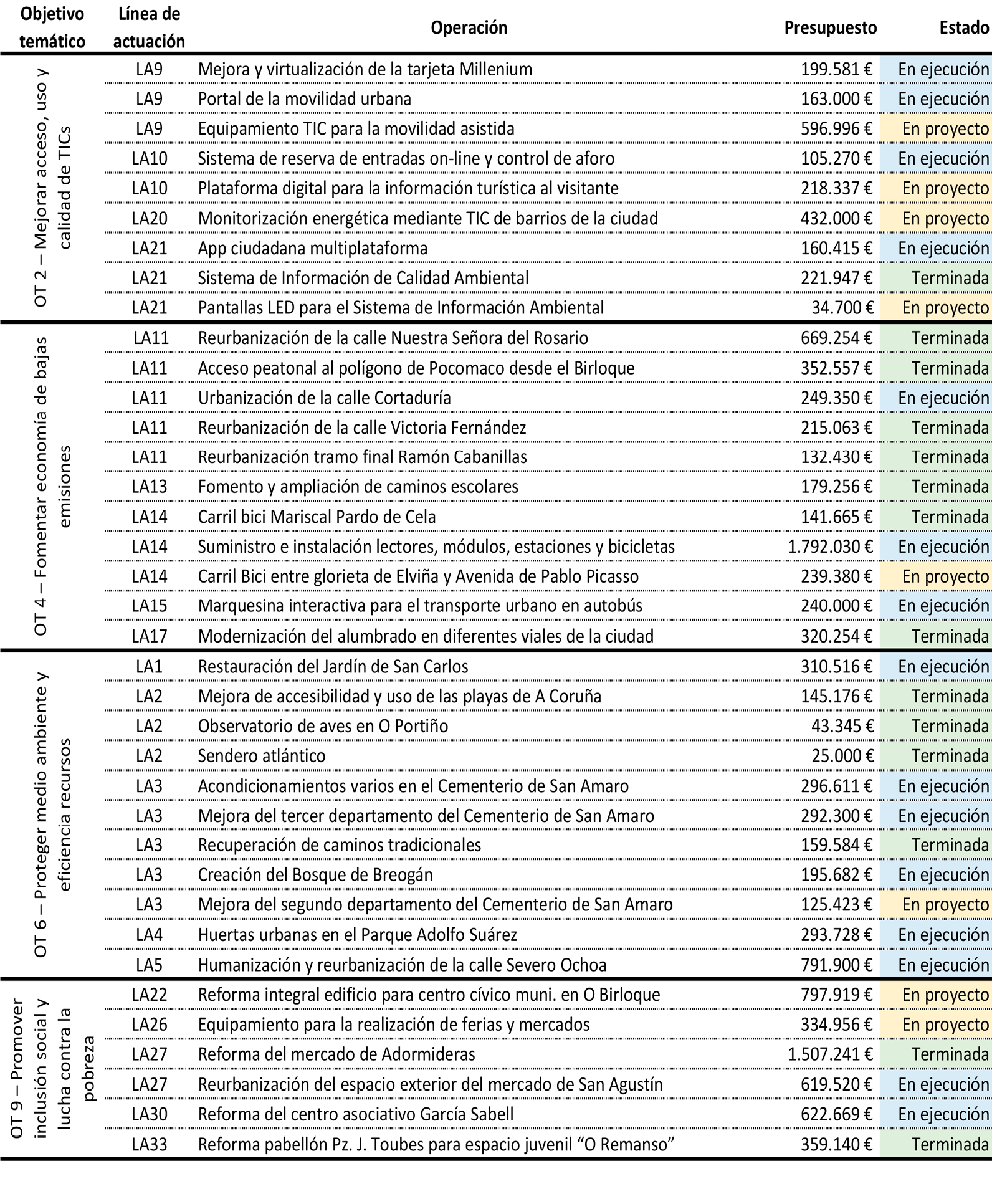 Actualmente, el Ayuntamiento declara que el 100% de las operaciones están aprobadas. De estas, según el mapa de obras publicado en la web de la EDUSI consultado en fecha 21 de junio de 20226 (Fig. 4 y Fig. 5), hay 14 operaciones ya ejecutadas (varias reurbanizaciones de calles para la mejora del espacio urbano -Fig. 7-; un observatorio de aves en un parque del litoral; la reforma de un mercado municipal; obras de mejora de un pabellón de uso comunitario -Fig. 6-, playas, caminos escolares y carriles bici, la recuperación de caminos tradicionales y la creación de un Sistema de Información de Calidad Ambiental), 15 en ejecución (reurbanizaciones y modernización del viario; obras de mejora de jardines, reforma de otro mercado, cementerio y movilidad lenta; reforma de un centro asociativo; desarrollo y mejora de herramientas basadas en TIC -Tecnologías de la Información y Comunicación- para optimizar la movilidad y creación de un bosque) y 8 en proyecto (relacionadas con accesibilidad, movilidad sostenible y recuperación de jardines y espacios comunitarios, principalmente).