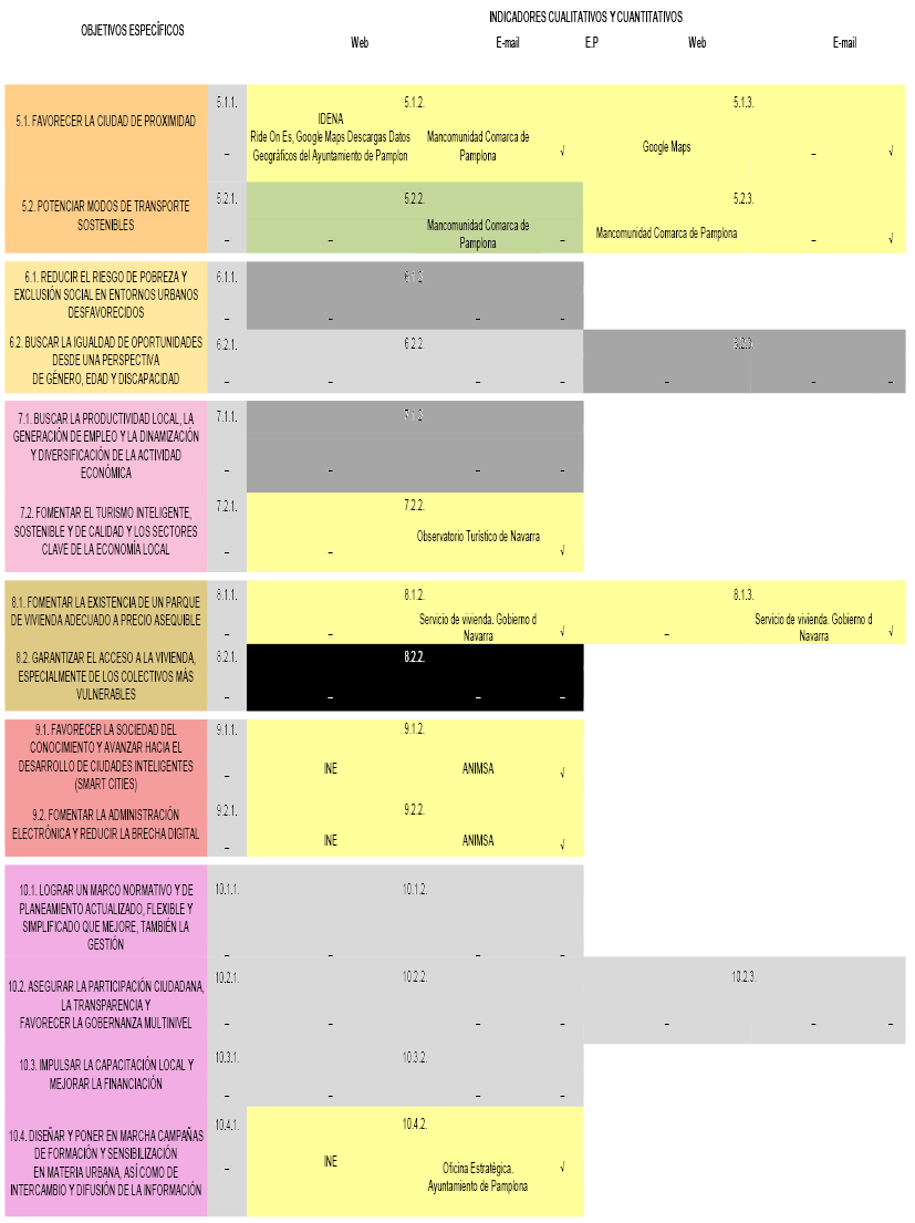 Los indicadores que quedan excluidos según dichos filtros se muestran en la figura 1 de la siguiente manera de acuerdo con su objetivo estratégico y específico: gris claro para los cualitativos, gris menos claro para los relacionados con el presupuesto, gris oscuro para aquellos que dependen de la puesta en marcha de algunas acciones del Plan de Acción, negro para aquel que no se ha conseguido la información necesaria y verde para los que existe el dato a nivel de ciudad. De este modo, resultan 20 indicadores susceptibles de georreferenciar y que se muestran en la figura 1 de color amarillo y naranja.