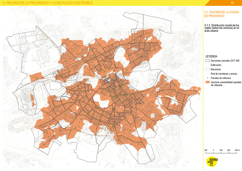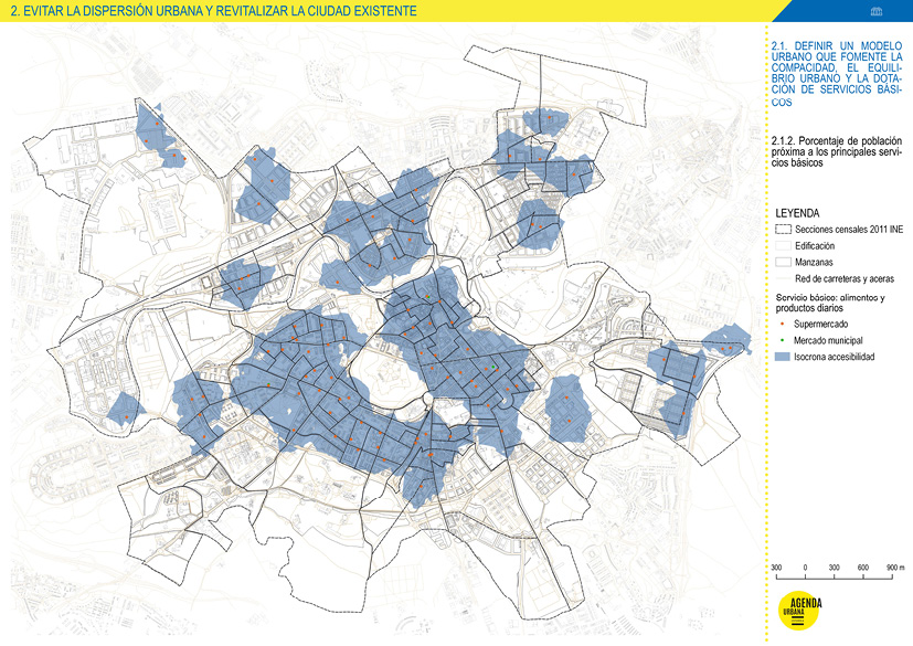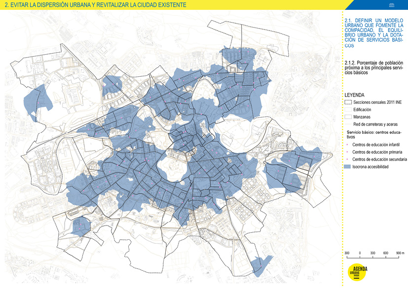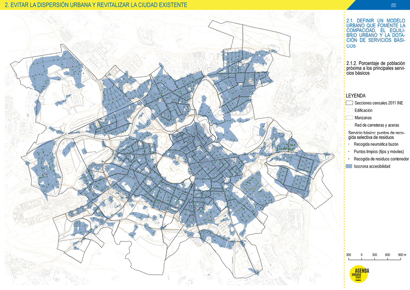 Este indicador mide el porcentaje de la población que reside cerca de los principales servicios básicos que conforman la ciudad, como son: el acceso a la alimentación y los productos básicos, los centros educativos, los centros sanitarios, los centros sociales, los centros deportivos, los centros culturales, los centros de entretenimiento y los puntos de recogida selectiva de residuos. Para definir con mayor precisión la palabra “cerca”, la AUE sigue una serie de distancias recomendadas: