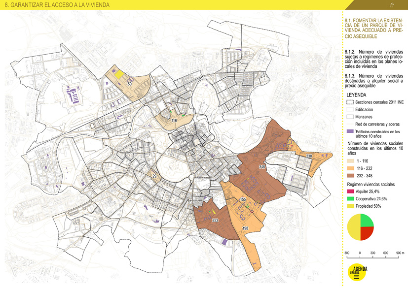El Objetivo Estratégico 8 (Garantizar el acceso a la vivienda) ha permitido conocer la ubicación de las viviendas sociales (en régimen de alquiler, propiedad y cooperativa) existentes en los 10 últimos años en Pamplona, además de obtener un indicador resultado del cociente entre el precio del metro cuadrado y la renta neta media por hogar en cada barrio. En definitiva, cuanto mayor sea este indicador, mayor es la dificultad de acceso a la vivienda. Como se ha comentado previamente, los barrios de Iturrama, San Jorge, San Juan, Ensanche, Buztintxuri y el Casco Antiguo se encuentran por encima de la media, pero si hay que destacar uno ellos sería el Casco Antiguo, cuyo indicador es el más elevado con diferencia.