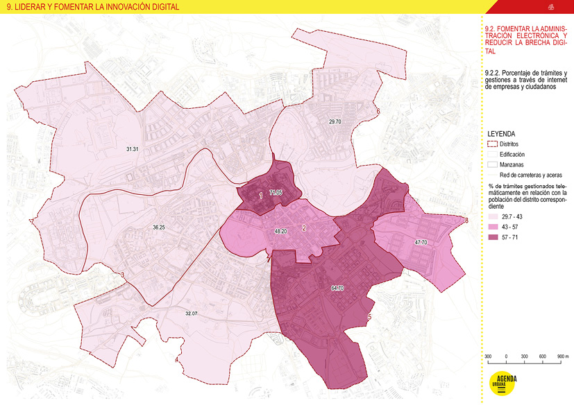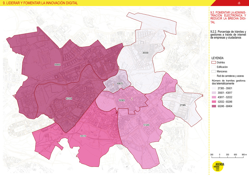 La metodología seguida, al igual que en el indicador 9.1.2, se ha modificado respecto a la definición que establece la AUE. Una vez recopilada y ordenada por distritos la información facilitada por ANIMSA, se ha calculado a su vez la población de cada distrito gracias al INE con fecha de 2021. La AUE mide el % de trámites por internet a través de la relación de los trámites online y los trámites totales. No obstante, debido a la falta de datos respecto a los trámites totales no telemáticos, en el presente trabajo se ha analizado el número bruto de trámites por distrito y a continuación la relación de estos trámites con la población del distrito, para destapar los distritos con mayor conocimiento de digitalización.