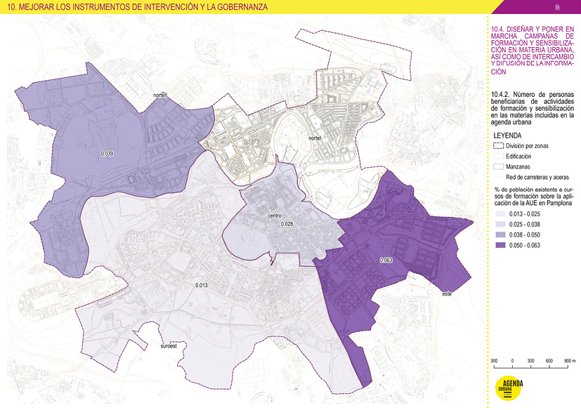 El Objetivo Estratégico 10, (Mejorar los instrumentos de intervención y la gobernanza) ha permitido conocer que el municipio de Pamplona en su conjunto necesita mejoras en este aspecto. Cierto es que algunos barrios presentan mejores números que otros, como Lezkairu y Mendillorri, seguidos de Buztintxuri y San Jorge. No obstante, tanto estos como el resto de la ciudad representan unos porcentajes de población asistentes a cursos y/o talleres de formación sobre la aplicación de la Agenda Urbana muy reducidos.