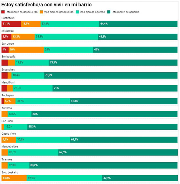 Además, ¿dónde aparece la ciudadanía y su capacidad de decidir sobre el entorno? Aparte del conocimiento crítico necesario, se precisa conocer la opinión vecinal para poder entender de manera óptima las necesidades del barrio. Hilando estos dos conceptos se presenta el siguiente gráfico extraído del Observatorio Urbano de Pamplona que muestra la satisfacción de la ciudadanía de vivir en el barrio en el que vive.