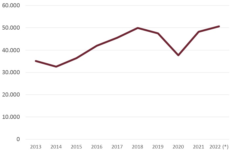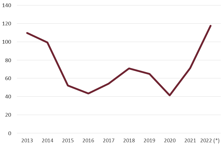 En el primer semestre de 2022 las ventas de viviendas protegidas crecieron en un 9,7% sobre el mismo periodo del año anterior. Ello implica una previsión de ventas de dicho tipo de viviendas de alrededor de 50000 en 2022, lo que supone el 7,3% de las ventas totales previstas de viviendas en este ejercicio (Fig. 21). Desde una proporción del 13,3% alcanzada en 2011, las ventas de viviendas protegidas han perdido peso cada año dentro del mercado de vivienda.