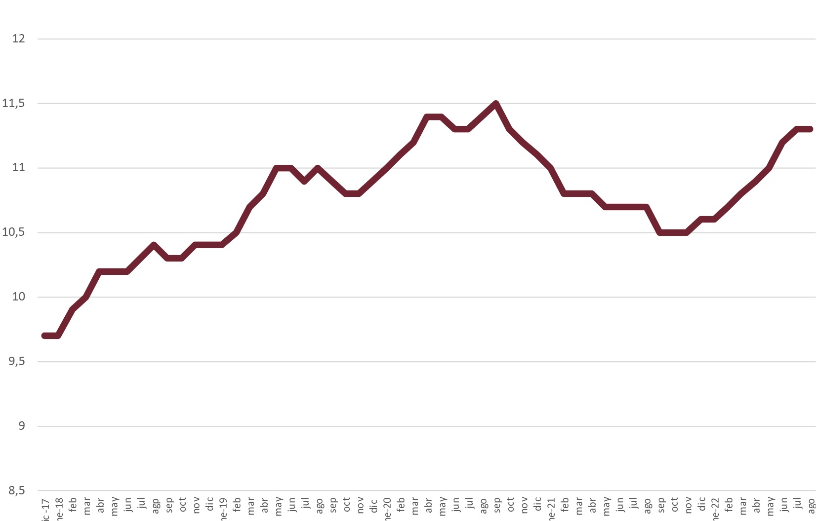 El índice de precios de consumo creció en agosto de 2022 en un 0,3%, por debajo del aumento intermensual del mismo mes del año anterior. La variación interanual fue del 10,5% en agosto. La variación anual de la inflación subyacente fue el 6,4%. La variación interanual de los productos energéticos de consumo fue el 37,4%, lo que implicó una desaceleración respecto de la variación interanual del mes precedente (40,2%) (Fig. 6).