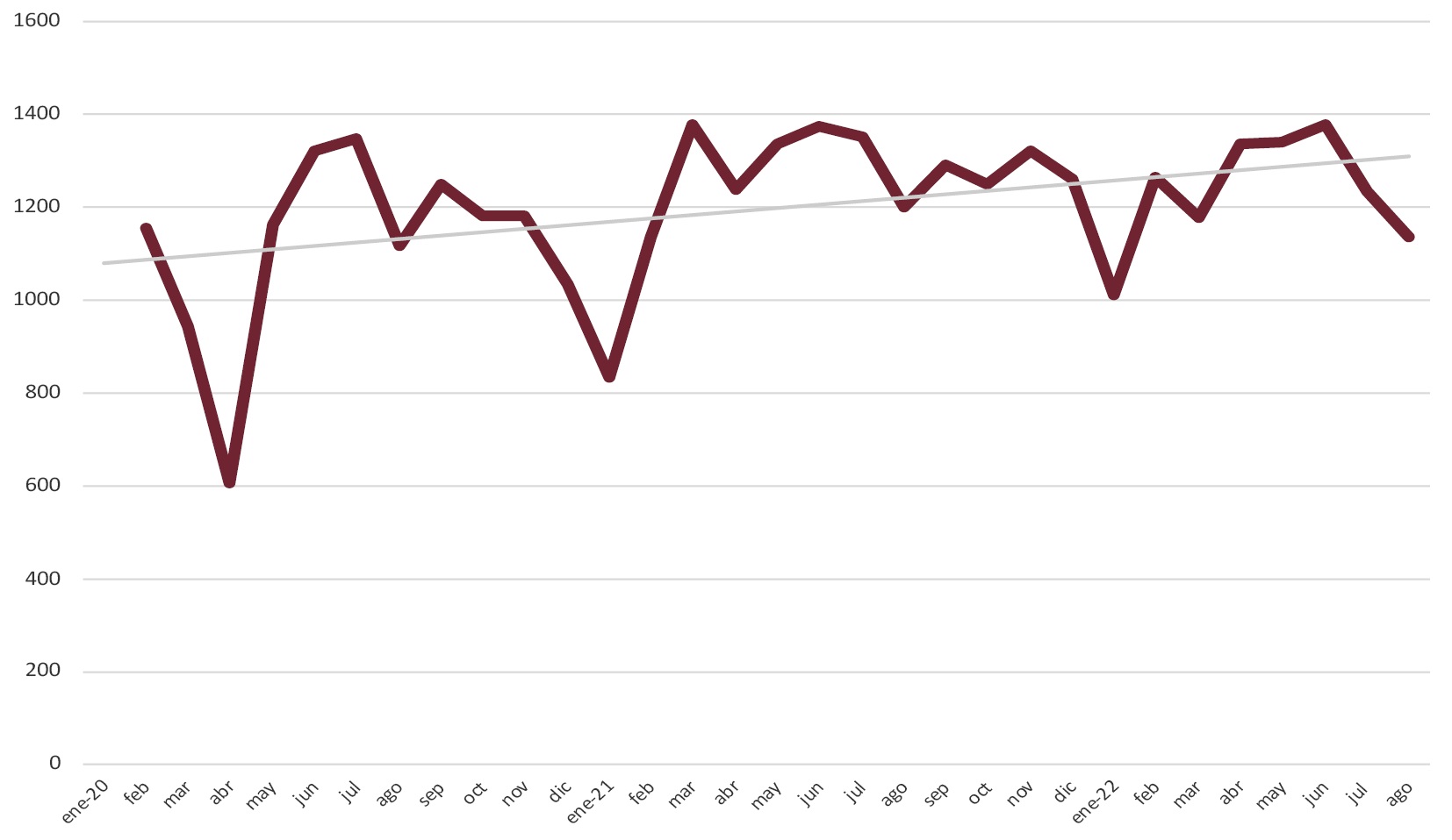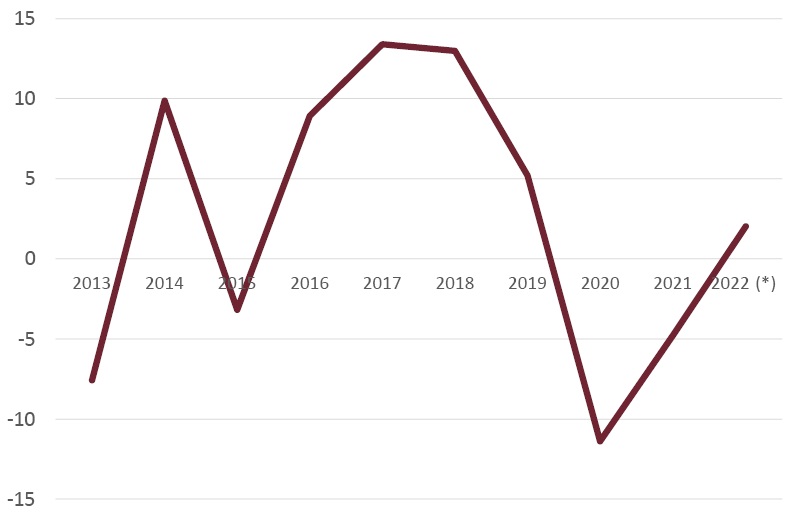 La evolución del consumo aparente de cemento aproxima la marcha del conjunto del sector de la construcción. Al retroceso de dicha magnitud en 2020 en un 8,8%, como consecuencia de la paralización de obras que provocó la pandemia, sucedió una intensa recuperación en 2021, año en el que el consumo aparente de cemento creció en un 11,6%. En 2022 persistió la evolución creciente durante el primer semestre, pero en los meses de julio y agosto de 2022 han tenido lugar retrocesos en los datos mensuales (Fig. 20), por lo que la variación interanual del periodo enero-agosto ha sido solo el 0,2%.