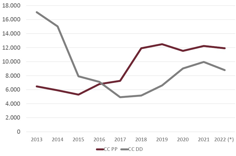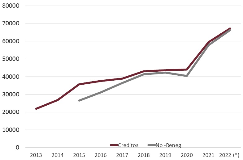 Los nuevos créditos destinados a la compra de vivienda aumentaron en un 13% en el periodo de enero-julio de 2022 respecto del mismo periodo del año anterior. Los créditos no renegociados, aumentaron en un 14,8% en el mismo periodo, alcanzando los volúmenes anuales más elevados desde 2010 (Fig. 15).