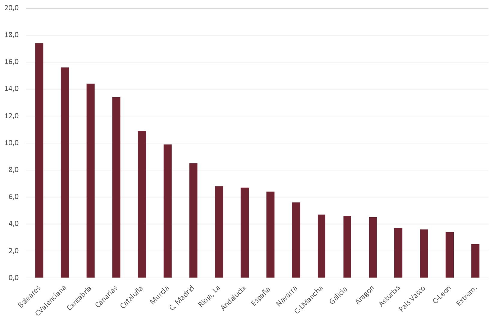 Las variaciones interanuales más acusadas fueron las de Baleares (17,4%) y Comunidad Valenciana (15,6%). De nuevo aparecen las autonomías del interior con los menores crecimientos, como es el caso de Castilla y León (3,4%) y Extremadura (2,5%) (Fig. 12). Los alquileres han vuelto a crecer conforme lo hacia la economía española tras la pandemia.