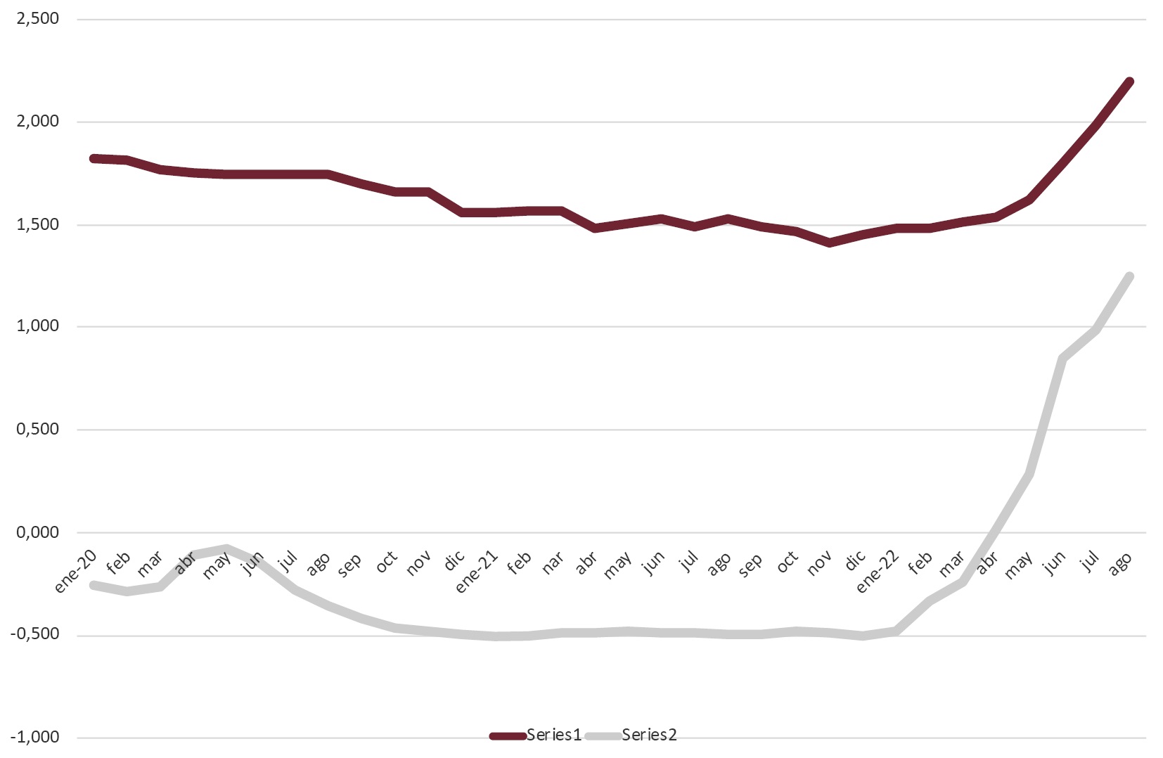 Tras permanecer situado en valores negativos en el periodo 2016-2021, el Euribor a doce meses ha registrado un importante aumento entre los meses de mayo y agosto de 2022. Dicha evolución es, sobre todo, consecuencia de las dos elevaciones de los tipos de interés efectuadas por el BCE en el transcurso de 2022, que habían sido precedidas por incrementos de mayor alcance por parte del Banco de la Reserva Federal de Estados Unidos.