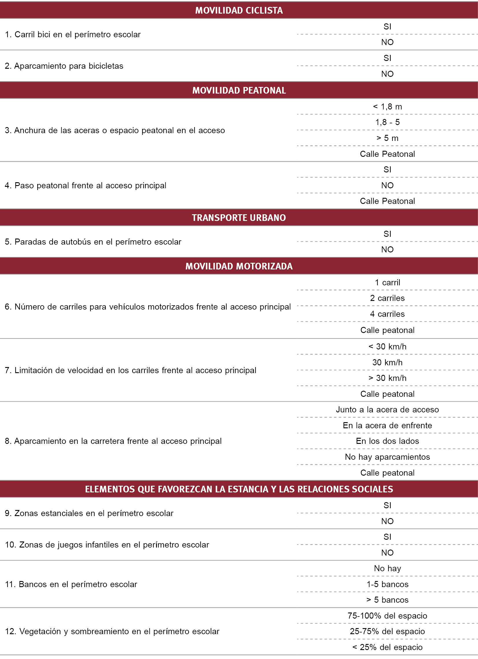 Para el estudio y análisis de los entornos escolares se ha utilizado el cuestionario de registro mostrado en la Fig. 1, el cual se ha diseñado de forma específica para el desarrollo del presente trabajo. Dicho cuestionario se ha elaborado teniendo en cuenta los principales aspectos que debe incluir un entorno escolar para considerarse sostenible de acuerdo con la bibliografía consultada (Álvarez Pedrerol & al., 2017; Ferrando & Molinero & Peña, 2007; Hermida & al., 2021; Silva Piñeiro, 2018; Villa-González & Pérez López, 2014; https://entornosescolares.es/), y expuestos en el apartado anterior. En base a estos aspectos considerados (tipos de movilidad y elementos que favorezcan la estancia), se ha elaborado un cuestionario con 12 indicadores, que se agrupan en cinco ámbitos diferentes: movilidad ciclista, movilidad peatonal, transporte urbano, movilidad motorizada y zonas estanciales. Estos cinco bloques incluyen elementos que incidirán directamente en la seguridad del entorno para la infancia y la comunidad educativa, en el desarrollo de la autonomía de la infancia y en los procesos de contaminación atmosférica y acústica que se den en el entorno urbano.