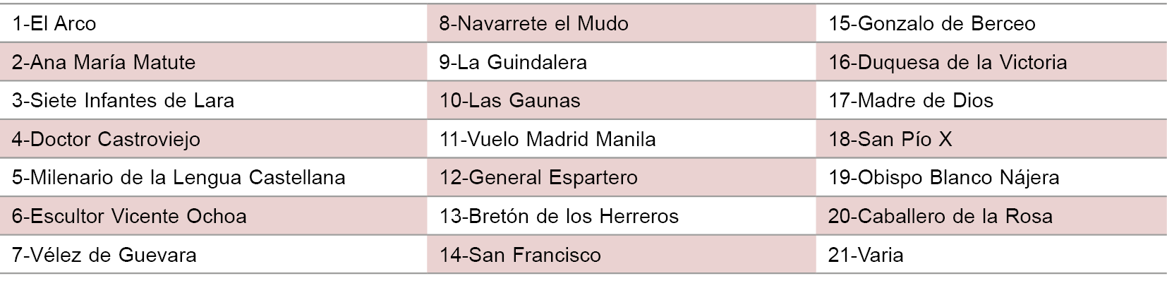 Fig. 2 / Listado de CEIP de Logroño. El entorno escolar de todos ello ha sido evaluado en el presente trabajo. Se han enumerado los centros de acuerdo con su distribución marcada en el mapa de la Fig. 3
