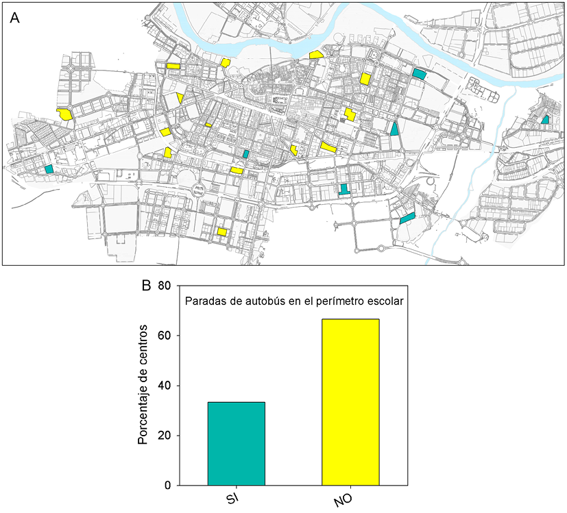 Figs. 8 A y B / Distribución geográfica (A) y porcentaje (B) de centros que tienen paradas de autobús urbano en el perímetro escolar. En el mapa de la Fig. 8A se muestran en azul los centros con parada de autobús urbano y en amarillo los centros que no la tienen