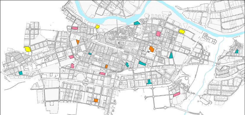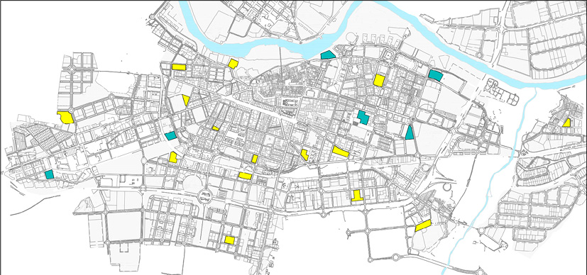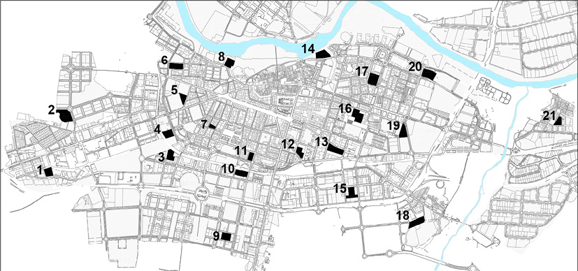 Fig. 3 / Mapa con los CEIP de la ciudad de Logroño. Se sombrea en negro el recinto escolar de cada centro y se enumeran, de izquierda a derecha, con los números que se detallan en la Fig. 1