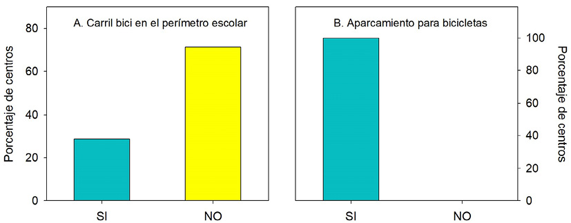 Figs. 4 A y B / Porcentaje de centros con carril bici en el perímetro escolar (A) y/o aparcamiento para bicicletas (B)